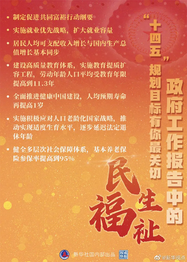 5日提请十三届全国人大四次会议审议的政府工作报告中对“十四五”规划和2035年远景目标纲要草案进行了概述,其中在“十四五”规划关于持续增进民生福祉方面有:
