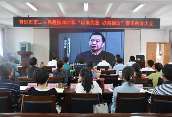 6月24日,普洱市第二人民医院召开2021年“以案为鉴 以案促改”警示教育大会。院党政领导班子成员、中层干部及党支部书记、副书记共计50余人参加会议。