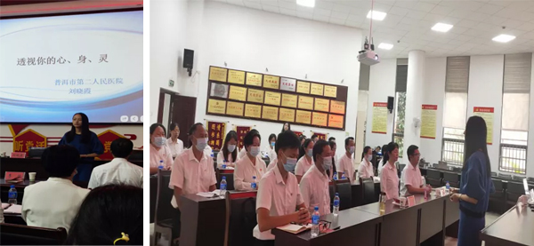 随着社会的飞速发展与进步,人们的心理压力与日俱增,心理健康问题越发突出。为进一步增强干部职工的心理健康意识,维护职工权益,缓解职工心理压力,促进职工身心健康。普洱市市委市直机关工委、市总工会、团市委、市妇联于2021年10月12日邀请普洱市第二人民医院睡眠医学中心刘晓霞医生到现场开展以“透视你的心、身、灵”为主题的心理健康知识讲座。