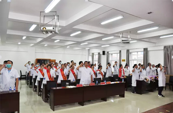 现场参加活动的医师庄严宣誓《中国医师誓言》,全体医师神情庄重,精神饱满,高举右手,铿锵有力的誓词宣示着医师工作者对职业的荣誉感、使命感、责任感。